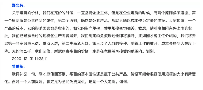 对于疫苗的价格方面,曾益新表示,疫苗的基本属性还是属于公共产品,价格可能会根据使用规模的大小有所变化。但一个大前提是,肯定是为全民免费提供。