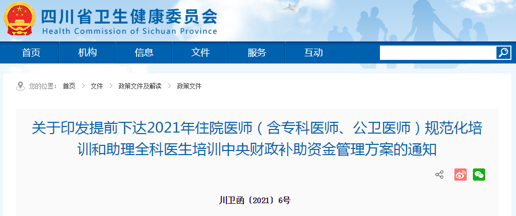 近日,四川省卫健委发布《关于印发提前下达2021年住院医师(含专科医师、公卫医师)规范化培训和助理全科医生培训中央财政补助资金管理方案》的通知。