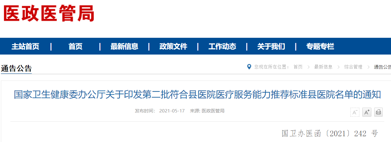 5月17日,国家卫健委发布《国家卫生健康委办公厅关于印发第二批符合县医院医疗服务能力推荐标准县医院名单的通知》(以下简称《通知》),公布了全国范围内第二批基本符合县医院医疗服务能力推荐标准的441家县医院(以下简称符合标准县医院)名单。