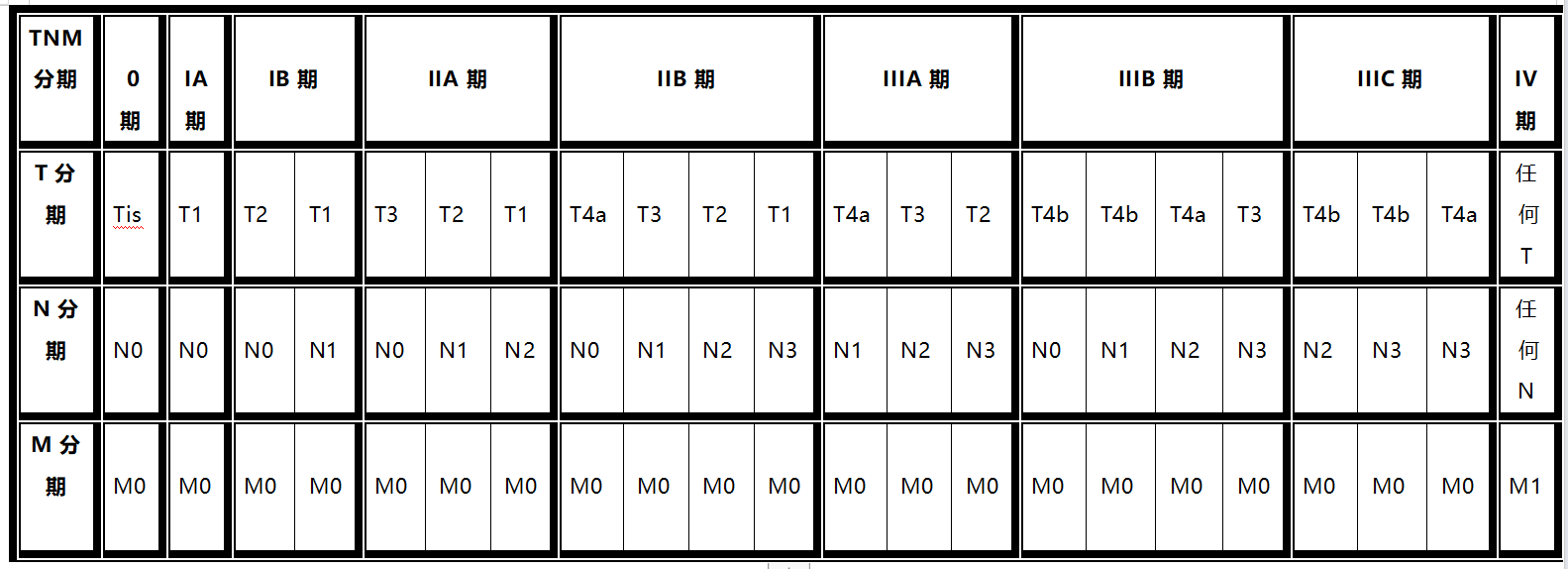 在此基础上,用 TNM 三个指标的组合划出特定的总分期,即肿瘤 I 期,II 期,III 期,IV 期等,有时候也会与字母组合细分为 IIa 或 IIIb 等等。如图: